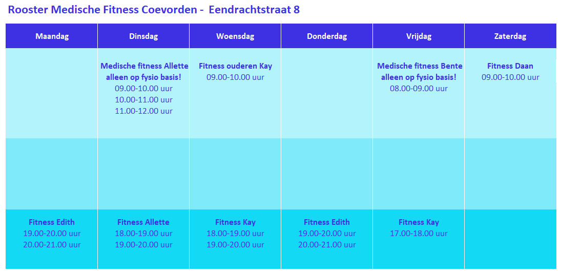 Sporten in groepsverband onder begeleiding van een fysiotherapeut of medische fitness trainer. Wij hebben verschillende mogelijkheden om bij ons te komen sporten. Hieronder volgt het reguliere rooster.